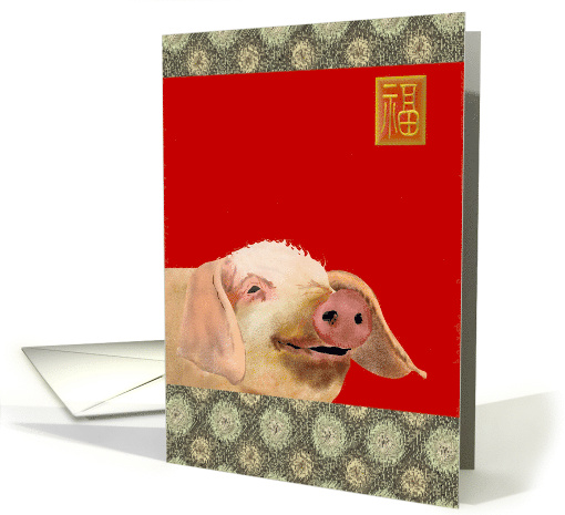 The pig ranks twelfth and is the last animal on the Chinese zodiac. People born in the year of the pig are diligent, sympathetic, generous and trusting. Here we have a sketch of the diligent pig. The Chinese character for luck (in the top right corner) is written in an old style.