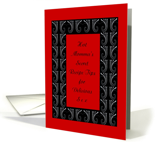 Sexy red and black recipe tips card shows your sweet honey some of the things you like to explore in bed and are just to shy to admit. "Isn't this a cute card?", one can say as an opener to great sex in the future. These tips help to engage all the senses.