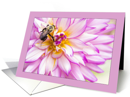 | Artist Notes: | Photography of a Bumble Bee climbing around a purple and white Dahlia flower during the middle of Summertime. This makes a lovely blank card for all occasions. It can be used for thanks, thinking of you, missing you or even a birthday card for a flower lover! |