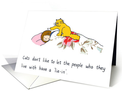 | Artist Notes: | Colourful cartoon of a woman asleep in bed with a ginger cat on top of her trying to wake her up. The words on the front of tha card are :- 'Cats don't like to let the people that they live with have a 'lie-in'. |