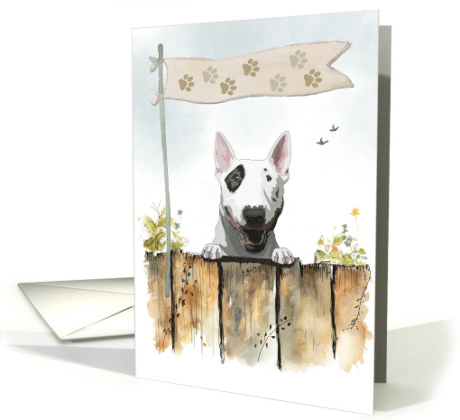 The playful English Bull Terrier, known for its unique look and lively spirit, is captured in this outdoor watercolor scene. A blank inside makes it the perfect choice for any occasion greeting.