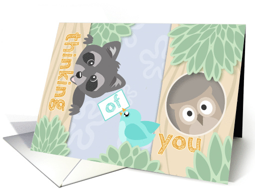 | Artist Notes: | A cute whimsical illustration of a gray raccoon looking over a tree that says "thinking" engraved in it, a blue bird holding a note that says "of" and a brown owl brown peering out of a hole in a tree with "you" text. |