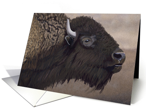 | Artist Notes: | This blank notecard features a magnificent North American bison on a windswept plain in multiple shades of brown, tan and taupe, with textural detail. |