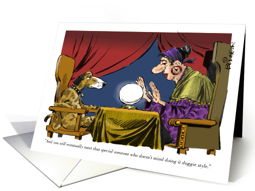 This blank any occasion greeting card shows a fortune-teller predicting a future for a canine client. I predict you'll purchase this adult high-quality blank by the hand-full.