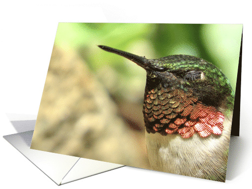 | Artist Notes: | This is an up close photograph of a Ruby Throated Hummingbird with beautiful iridescent feathers and colouring! Truly a stunning bird! blank note card for any occasion. |