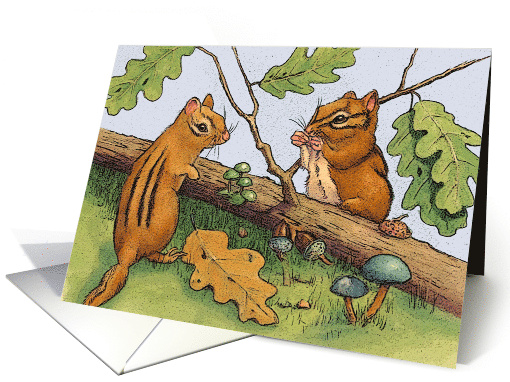 This card features an original drawing of two cute, fluffy chipmunks. One is happily munching on an acorn. A fallen oak branch lies between the two. The card is blank inside, making it suitable for almost any occasion and/or for printing and framing by the recipient if desired.