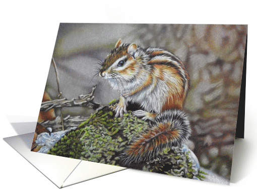 | Artist Notes: | This card is reproduced from my original colored pencil painting of a chipmunk sitting on a lichen cover rock . It is intentionally left blank inside for you to create a special card for that special someone. |