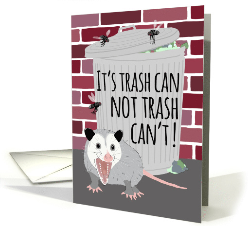 | Artist Notes: | A really fun blank note card with some encouraging words and featuring an optimistic opossum, a trash can and some flies. |