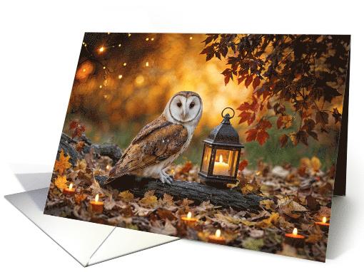 | Title: | Owl in Fall Leaves with a Lantern and Candle Mystical Blank |