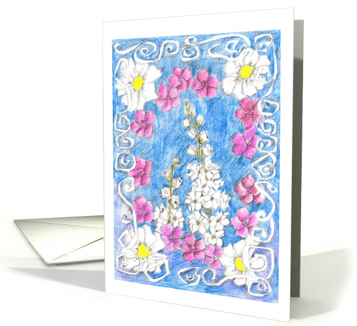 | Artist Notes: | A pretty floral blank note card decorated with white spring garden flowers drawn in pencil with pink begonia style flowers with swirls and flourish accents on a bright sky blue background done in colored pencil. |