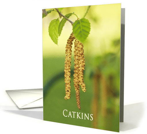 Pretty note card with simple catkins hanging on a white Birch Tree. Blank inside to write your own message.