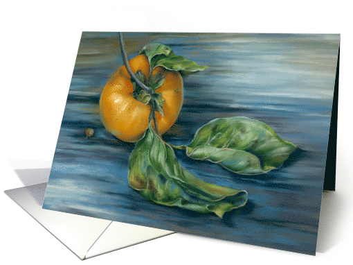 A beautiful blank note card with an autumn theme, this design features still life fine artwork in soft pastel picturing a ripe persimmon in shades of yellow orange with drying, curled leaves of green spotted in brown on a backdrop of weathered wood in cool shades of blue and purple. Persimmons are a fall season fruit that may symbolize longevity and good fortune.