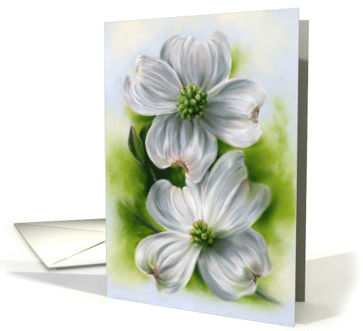 | Artist Notes: | This beautiful floral blank note card is embellished with fine artwork created in soft pastel shades of green, white, cream and blue depicting a branch of dogwood in the springtime bearing a pair of delicate flowers. This tree that is native to the US Southeast also happens to be the state flower of both North Carolina and Virginia. |