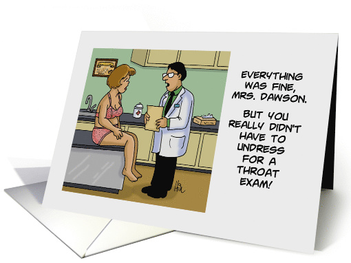 Any Occasion Blank Note Card with a cartoon showing a doctor talking to his female patient who is in her underwear. He says, Everything was fine, Mrs. Dawson. But you really didn't have to undress for a throat exam!