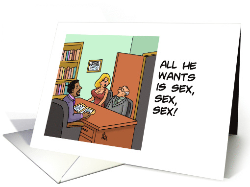 Humorous Blank Card with a cartoon showing a couple in a marriage counselor's office. She is young, while he is very old. She is complaining. The words say: All he wants is sex sex sex!