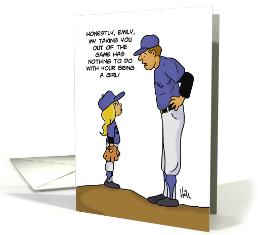 | Artist Notes: | Humorous card with a cartoon showing a girl baseball player and her coach/manager. He says, Honestly, Emily, my taking you out of the game has nothing to do with your being a girl! Inside is blank. |