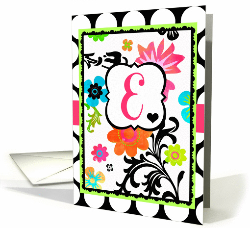 Title: | 'E' Monogram Note Card, B right Tropical Floral on polka dots! |