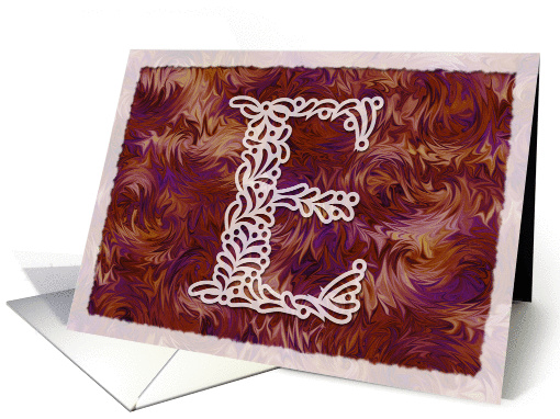 Marbled Paisley background with fiery colors. Blank inside for custom notes. Ornamental Monogram Letter E.