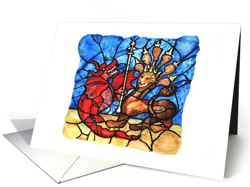 | Artist Notes: | The painting upon which this card is based was inspired by a detail from the Great East Window in York Minster, England. It depicts a scene from the Book of Revelations (13:1-2) where the Dragon gives Power to the Beast. The vivid stained glass colours are beautifully replicated by watercolour. The painting is by Christine Burn. Inside is left blank for your own message. |