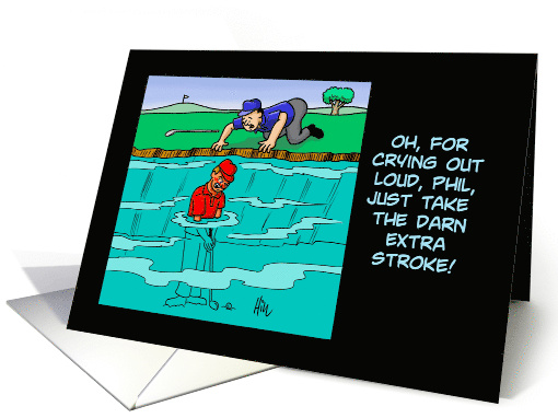 | Artist Notes: | Blank Note Card with a cartoon showing a golfer standing in a water hazard. The other golfer looking on says, Oh, for crying out loud, Phil, just take the darn extra stroke! |