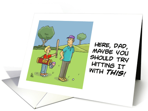 | Artist Notes: | Blank Note card with a cartoon showing a father and son. The son is the caddy and holds up a baseball bat. The words say, Here Dad, maybe you should try hitting it with this! |