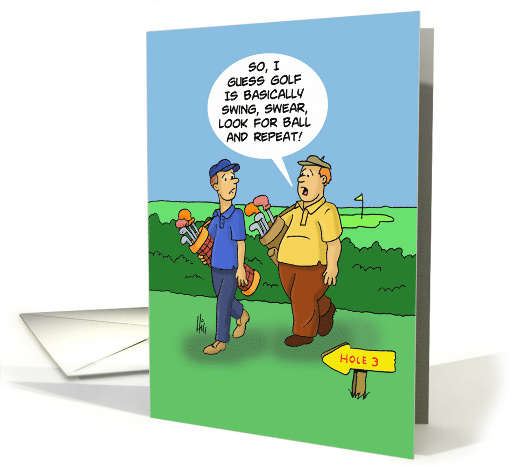 | Artist Notes: | Humorous Golf Themed Blank note card with two cartoon golfers. One says: So I guess golf is basically swing, swear, look for ball and repeat! |