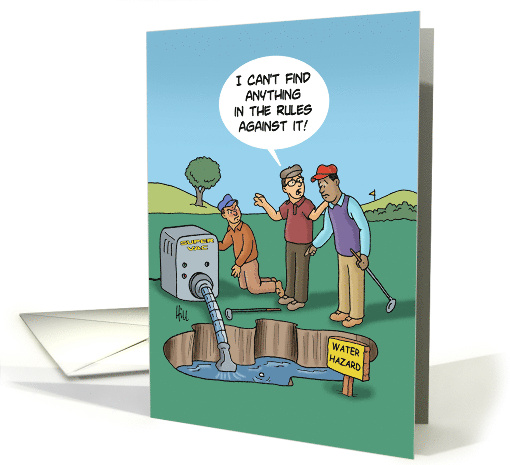| Artist Notes: | Humorous Blank card with a cartoon showing three golfers. Two are talking while the third is draining the water out of a water hazard to retrieve his ball (and avoid a penalty stroke) The words say: I can't find anything in the rules against it! |