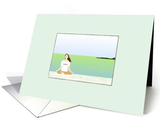 | Artist Notes: | The sky has been filled with a blue/white gradient to give a sunny day feel, and the sea has a blue/green gradient. A lady with flowing auburn hair sits cross legged on the beach, wearing a T-shirt with the words 'Namaste' |