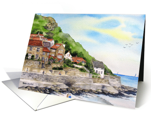 Watercolor painting by myself, Farida Greenfield. A beautiful dainty coastal village in North Yorkshire, England with its lovely traditional stone cottages and homes in summer time with lovely sky and distant boats sailing on the background. The card is designed for Blank Notecard and blank inside.