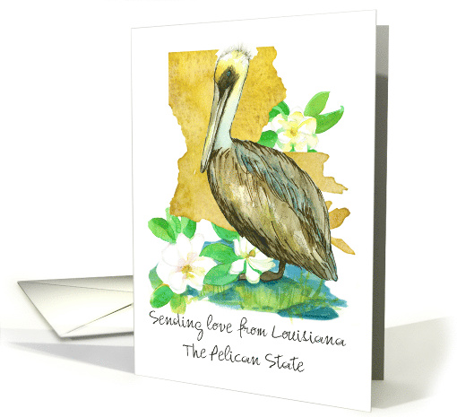 | Artist Notes: | Sending love from Louisiana greeting card to keep in touch with friends and family decorated with the brown pelican, magnolia flowers, and the state shape hand painted with watercolor. |