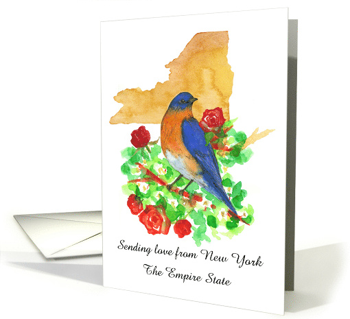 | Artist Notes: | Sending love from New York decorated with a regal bluebird on a branch of a blooming tree in spring with red roses and the state shape hand painted in a shade of cafe latte with watercolor. |
