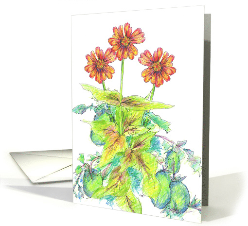 | Artist Notes: | A blank note card featuring three bright red zinnia flowers growing with roma tomatoes sketched in ink and colored with colored pencil in bright shades of summer. |