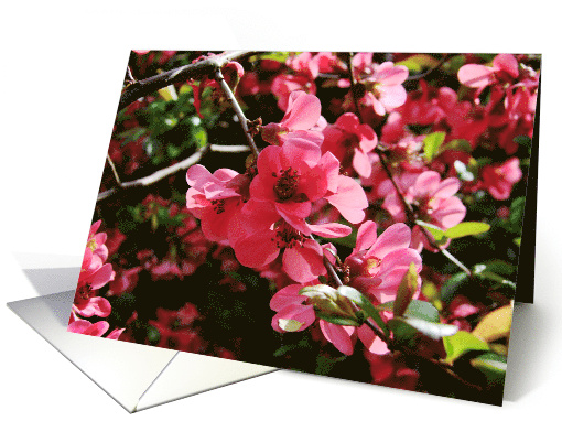 | Artist Notes: | A closeup shot of vibrant pink flower blossoms on a Hawthorn bush set in a lovely flower garden makes for a beautiful blank notecard to share with someone special. |