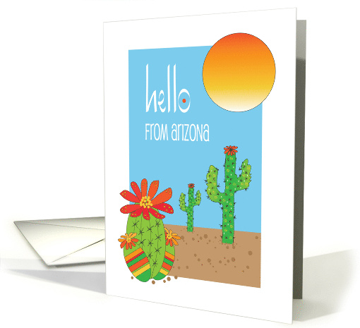 | Title: | Hello from Arizona with Flowering Cactus Saguaros and Desert Sun |