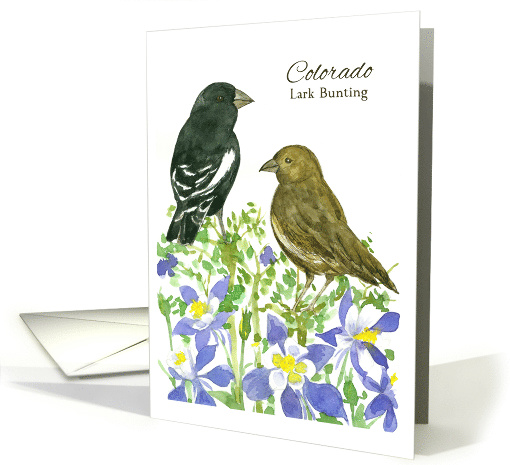 | Artist Notes: | Greetings from Colorado card featuring a pair of Lark Bunting birds resting near bright blue rocky mountain columbine wildflowers drawn with ink and painted with watercolor. Inspired by the state bird and state flower of Colorado. |