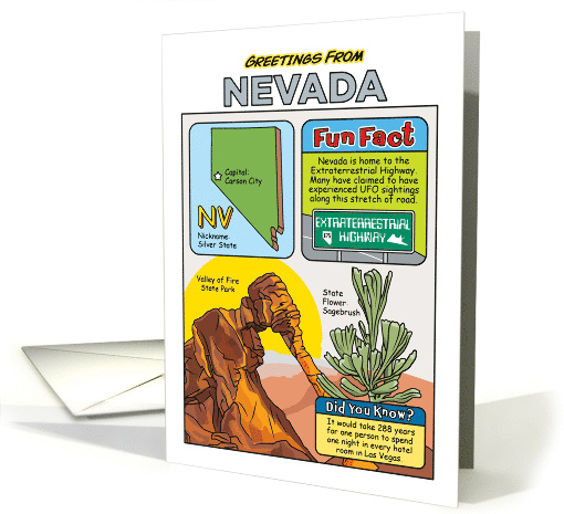 | Artist Notes: | Greetings from Nevada landmarks and symbols. Illustrations include a Sagebrush plant and Valley of Fire State Park. State capitol is Carson City and nickname is Silver State. |