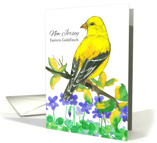 | Artist Notes: | A bright yellow Eastern Goldfinch bird in a leafy branch with a border of purple violets illustrated with sepia ink and watercolor. Inspired by the state bird and state flower of New Jersey. |