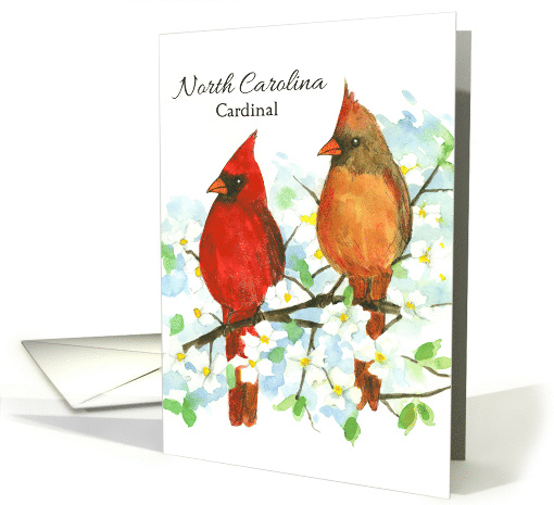 | Artist Notes: | A watercolor illustration of a cardinal couple sitting in a blooming dogwood tree decorates this greeting card from North Carolina. Inspired by the state bird and state flower. |