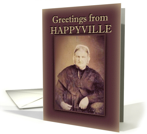 | Artist Notes: | (My apologies to Susan A. Moore, a distant relative.) This sarcastic and humorous card will lift the spirits of those who may be feeling isolated and depressed during the Covid 19 pandemic, or those people who are simply feeling low and need a smile. The "tough old broad" on this funny card is sure to bring a smile, with her grumpy and forbidding face. (Do we see a hint of a moustache?!) Greetings from Happyville may be personalized with a photo inside and you may change the inside text to say whatever you like. |