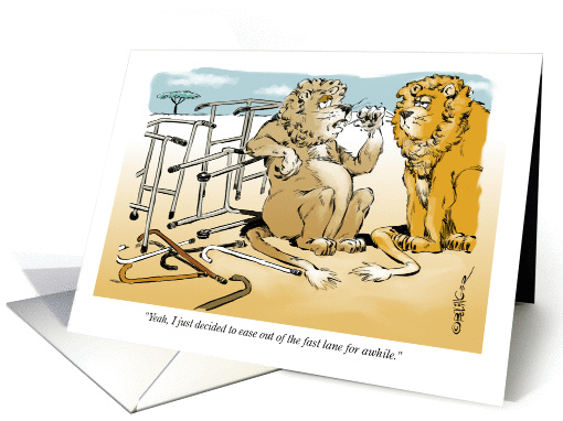 | Artist Notes: | The cartoon scene shows an old lion explaining that he's taking life a little slower these days. This is a blank any occasion heavy-duty card that can be filled out slowly. |