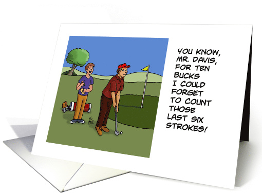 | Artist Notes: | Humorous Blank Note card with a cartoon showing a man about to putt onto the green, and his teen caddy. The words say: You know, mr. davis, for ten bucks I could forget to count those last six strokes! |