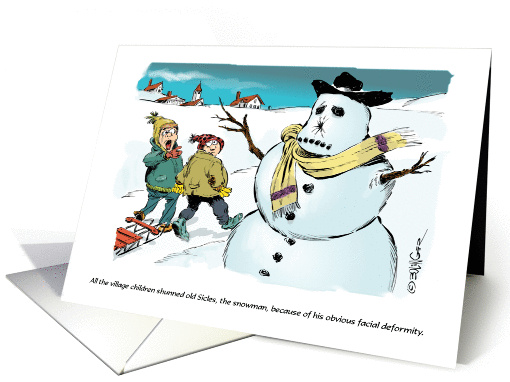 The cartoon snowman stands without a carrot nose and the passing village boys are horrified. They all shunned good ole Sicles because of that deformity. Send this blank high-quality card to someone special, along with a carrot.