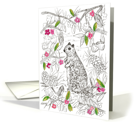 A blank note card featuring a pen and ink sketch of a squirrel in a forest setting with pine cones, branches with pink blossoms, and acorns.
