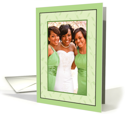 | Artist Notes: | Picture frame style photocard with pattern of subtle leaves to frame your photo. Green. Blank inside. Portrait orientation. This card is also available in a landscape orientation. |