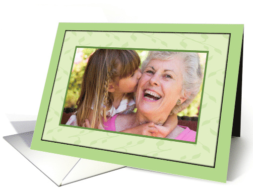 | Artist Notes: | Picture frame style photocard with pattern of subtle leaves to frame your photo. Green. Blank inside. Landscape orientation. This card is also available in a portrain orientation. |