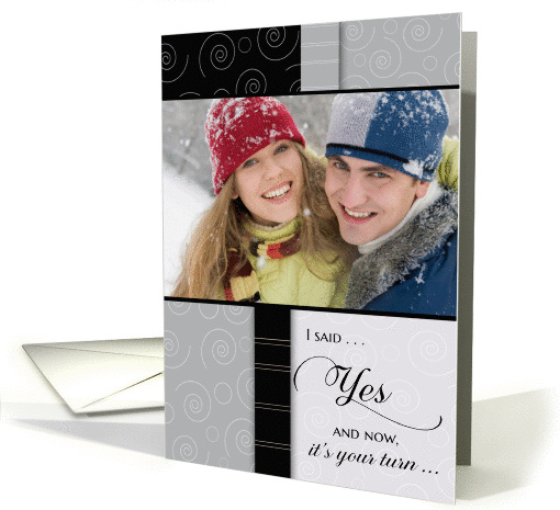 Artist Notes: | You've accepted a proposal for marriage! Insert a photo of you and your fiance in this black & gray invitation to ask your friend to be a bridesmaid in your upcoming wedding. Will look great with either a black & white or color photo. |