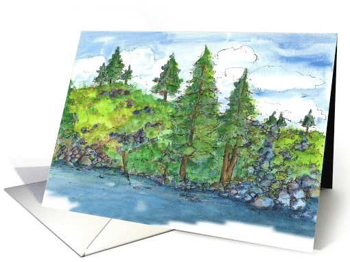 | Artist Notes: | A blank notecard with a scene inspired by Cathedral Lake on Mt. Tallac on the south shore of Lake Tahoe with evergreen trees on a hill, grasses, and rocks illustrated with watercolor. |