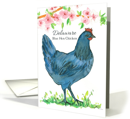 | Artist Notes: | A blue hen chicken strolling along under a peach tree filled with pink blossoms illustrated with watercolor. Inspired by the state bird and state flower of Delaware. |