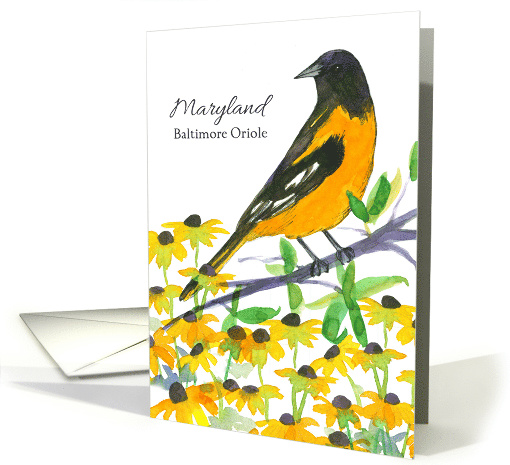 | Artist Notes: | The black and yellow Baltimore Oriole sits on a branch in a garden of black-eyed susan flowers painted in shades of bright orange-yellow illustrated with watercolor. Inspired by the state bird and state flower of Maryland. |