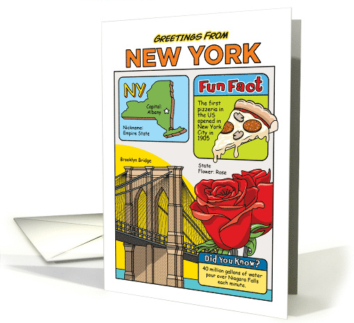 | Artist Notes: | Greetings from New York landmarks and symbols. Illustrations include a rose, Brooklyn Bridge and a slice of pizza. State capitol is Albany and nickname is Empire State. |
